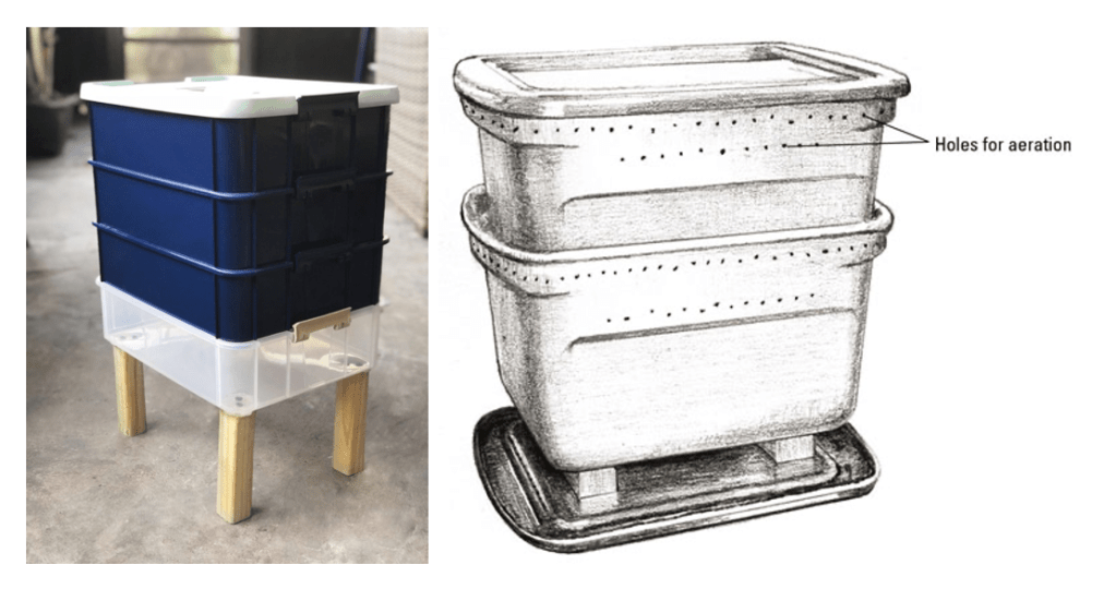 Existem vermicompostores já feitos, como os da Revolução das Minhocas ou da BioRecycle, mas é muito fácil fazer o nosso. Basta ter 3 caixas iguais, de plástico ou madeira (metal não aconselho porque é muito termocondutor). Na de baixo vai ficar o líquido que resulta da vermicompostagem (que só existe mesmo neste tipo de compostagem e que é muito bom para adubar a terra durante a rega – bem diluído!). Nas duas de cima vamos colocando os resíduos orgânicos, mas convém ter duas porque, quando a do meio estiver cheia, começamos a colocar na de cima e deixamos a do meio ficar a maturar o composto durante os 2 meses. A única coisa que temos de ter atenção é que as caixas têm de comunicar entre si (ter furinhos) e as duas de cima têm de receber oxigénio, pelo que devem ter também furos nas laterais. Idealmente, o compostor está elevado, para ser fácil retirar o líquido da caixa de baixo e para diminuir o acesso de roedores ao compostor, caso existam nas proximidades.